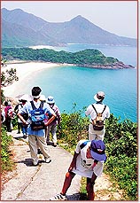 | 香港にはよく整備された遊歩道、「トレール(道)」が各地にあります。例えば、夜景で有名なビクトリア・ピークには、1985年に完成した香港で3番目に古い「ホンコントレール」の出発点があり、香港島を西から東に横断し、総距離50キロ、標準15時間のハイキングコースとなっています。ケーブル・カーの山頂駅近くが出発点で、しばらく行くと林に囲まれ、小鳥のさえずりとさわやかな風が楽しめます。時折、道の周囲を覆った木々がとぎれ、眼下に高層ビル群とビクトリア湾、九龍半島の街や山並みが一望できます。 香港では、都会の中での生活から抜け出して、山歩きを楽しむ人が意外と多いのです。山歩き仲間たちは週末になると、香港島だけでなく、九龍半島の山々を歩きます。そして、彼らの究極の目的は、香港を代表するスポーツ・イベントである「トレール・ウォーク」への挑戦です。 | |