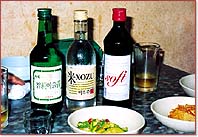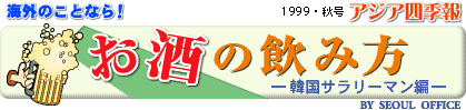 | 構造調整も一段落し、韓国経済回復を示す指標が増えてきた昨今、企業のスリム化が進み、韓国の従来の企業文化も、相当変化してきてるようです。ある財閥グループで職員を対象に「なくなって欲しい企業文化」をアンケートしたところ、1位は「上司の強圧的軍隊調命令文化」、2位は「浪費文化」、3位は「残業美徳主義」で、「慣習依存文化」、「お酒強制の会食文化」などもありました。年功序列制も徐々に崩壊し、年俸制も増え、上司だからといって安閑としていられない時代になってきたようです。 | ![]() 韓国の居酒屋に並ぶ一般的なお酒 |