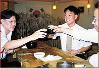 | 韓国の会社では、月に2回程度社員同士で会食をしますが、驚いたことに社内の会食も経費で賄われています。しかし、IMF体制以降、経費削減により、会食の回数は減り、質も低下してきているようです。会食は、ふつう2〜3次会まで行われ、1次会は食事で、焼き肉屋さんでのケースが多いようです。2次会は、主に「ビアホール」で生ビールを飲んで、3次会はカラオケなどに行きます。 | |