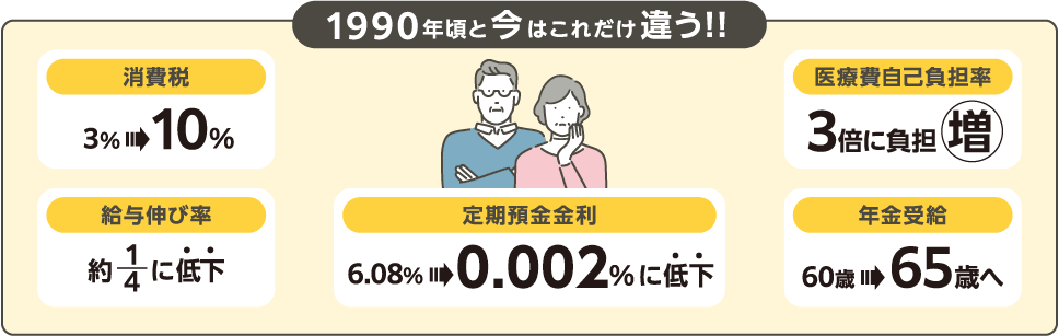 人生100年時代と言われる中、ご退職後の時間(セカンドライフ)が長くなる一方、定期預金の金利をはじめとした暮らしを取巻く環境は1990年頃と比べて大きく変わっています。