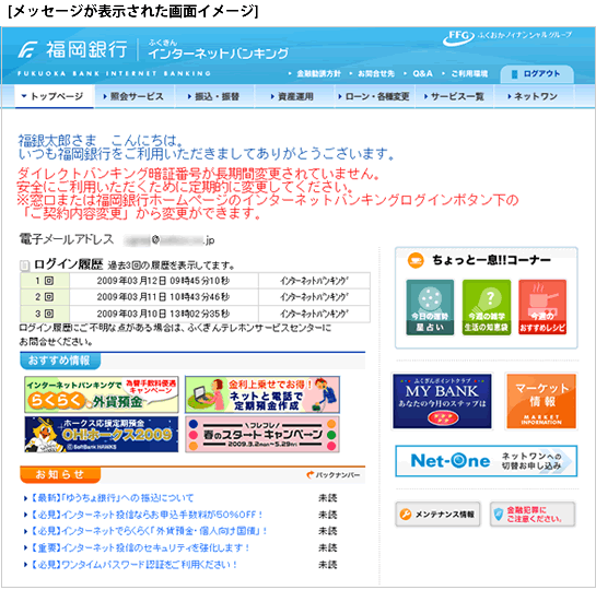 ダイレクトバンキング暗証番号の定期的な変更を促すメッセージを