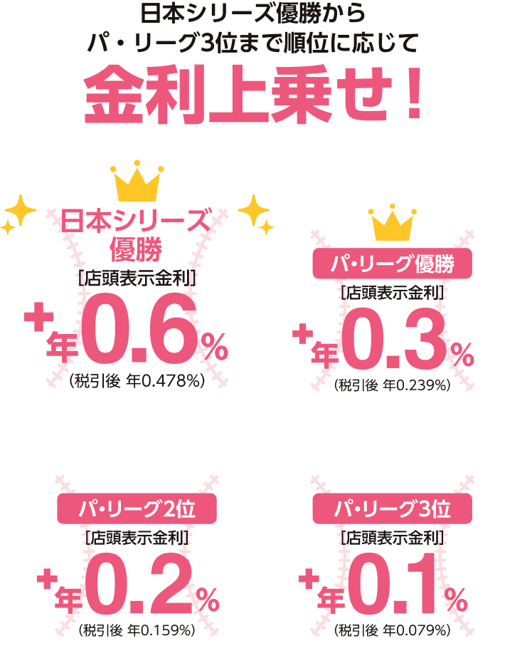※税引後 年0.796% ※2026年2月28日時点の店頭表示金利【1年もの】0.4%(税引前)に日本シリーズ優勝時の上乗せ分0.6%(税引前)を加えた金利