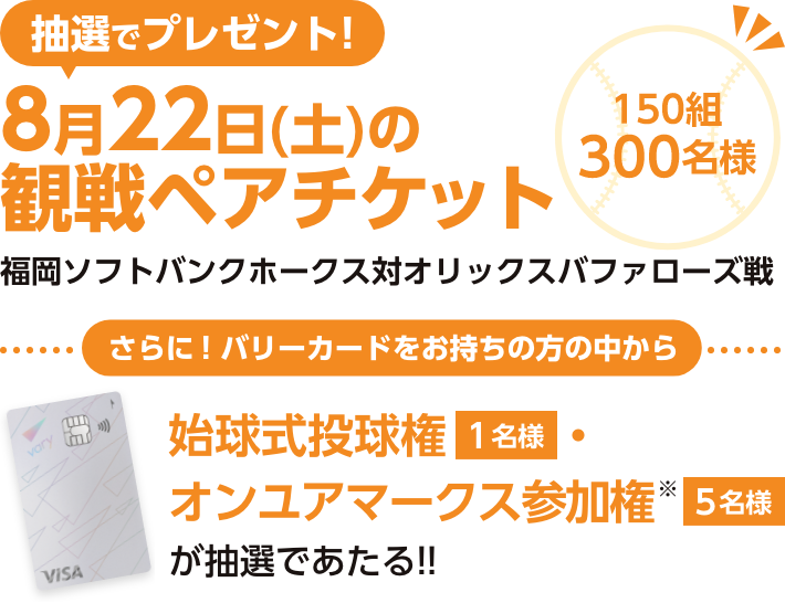 ※オンユアマークスは、始球式の直前にフィールド上の9箇所の守備位置にて選手を出迎えることができるイベントです。選手の指定はできません。参加対象年齢は4歳以上中学生以下に限ります。※抽選時点でバリーカードに入会されている方が対象です。