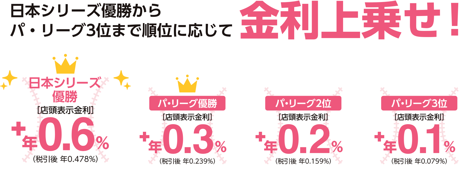 ※税引後 年0.796% ※2026年2月28日時点の店頭表示金利【1年もの】0.4%(税引前)に日本シリーズ優勝時の上乗せ分0.6%(税引前)を加えた金利