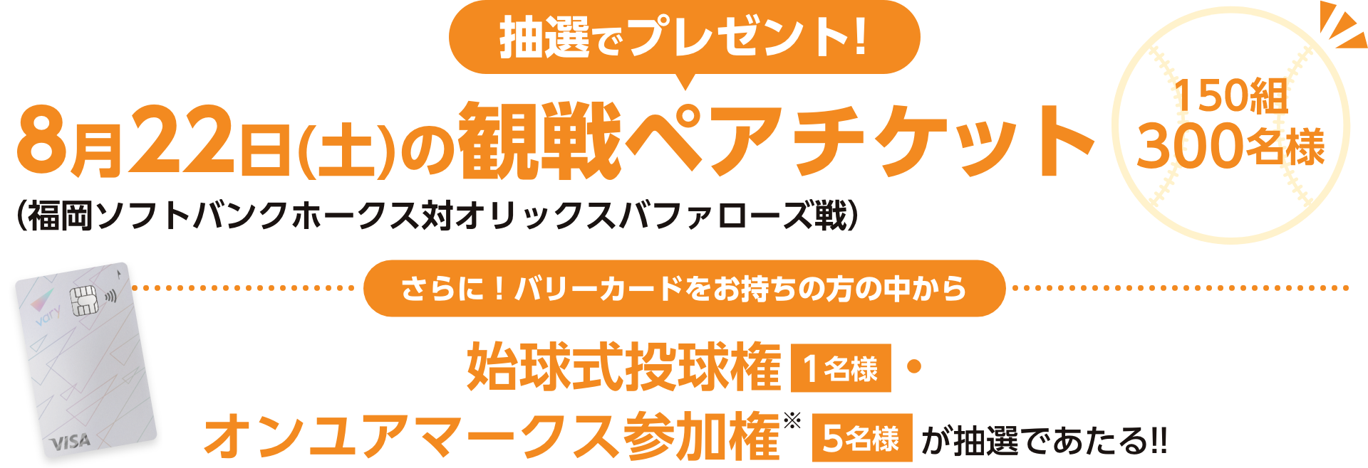 ※オンユアマークスは、始球式の直前にフィールド上の9箇所の守備位置にて選手を出迎えることができるイベントです。選手の指定はできません。参加対象年齢は4歳以上中学生以下に限ります。※抽選時点でバリーカードに入会されている方が対象です。
