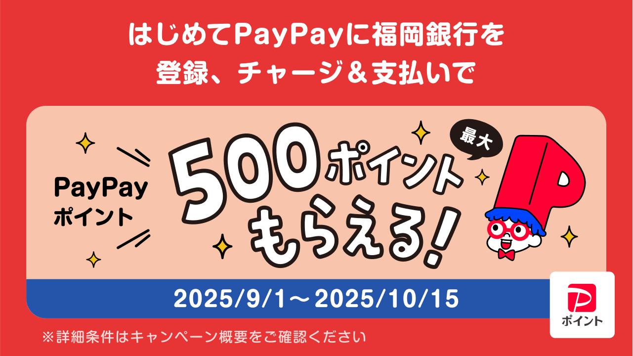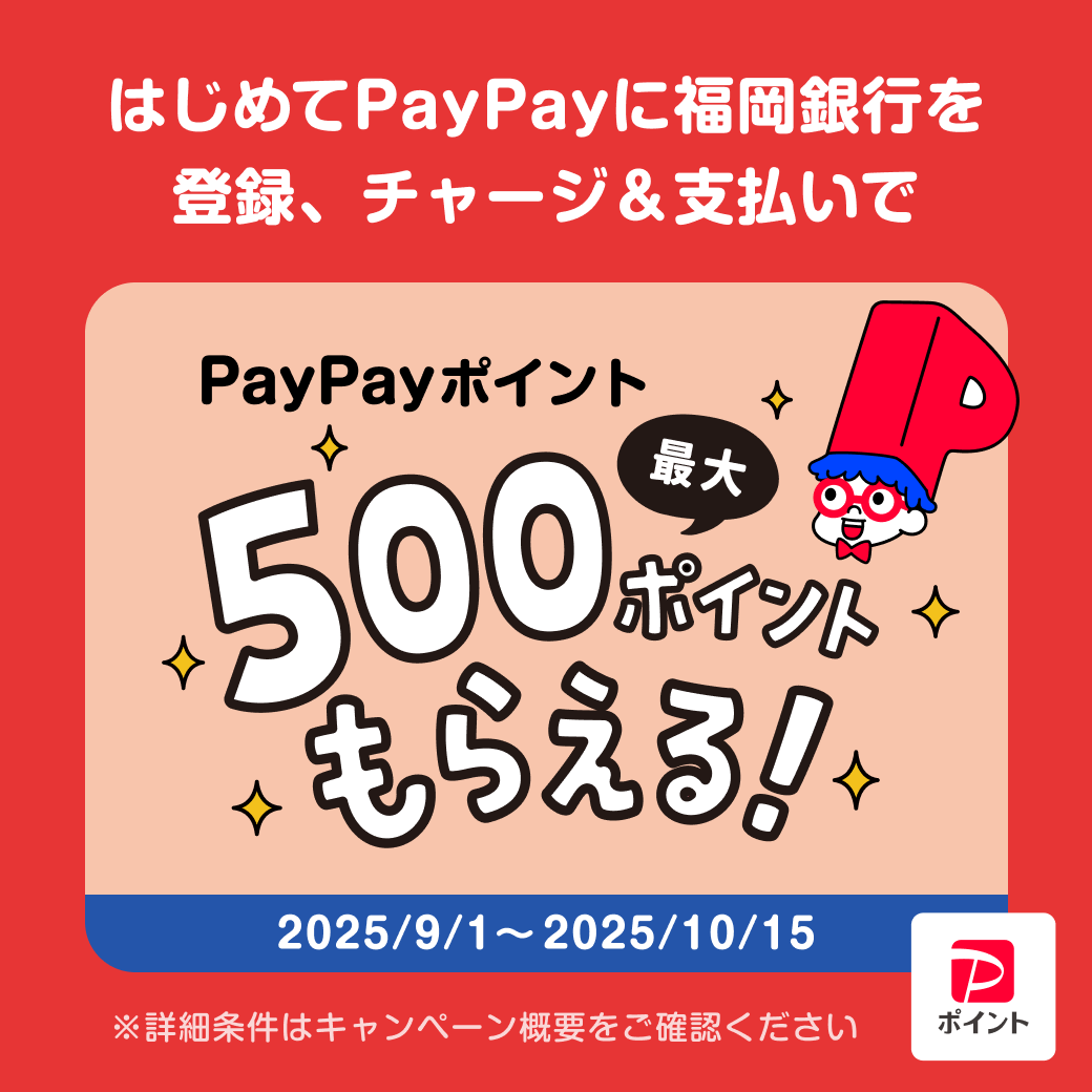 - (1)キャンペーン期間中にPayPayアプリにはじめて福岡銀行をチャージ用口座として登録
