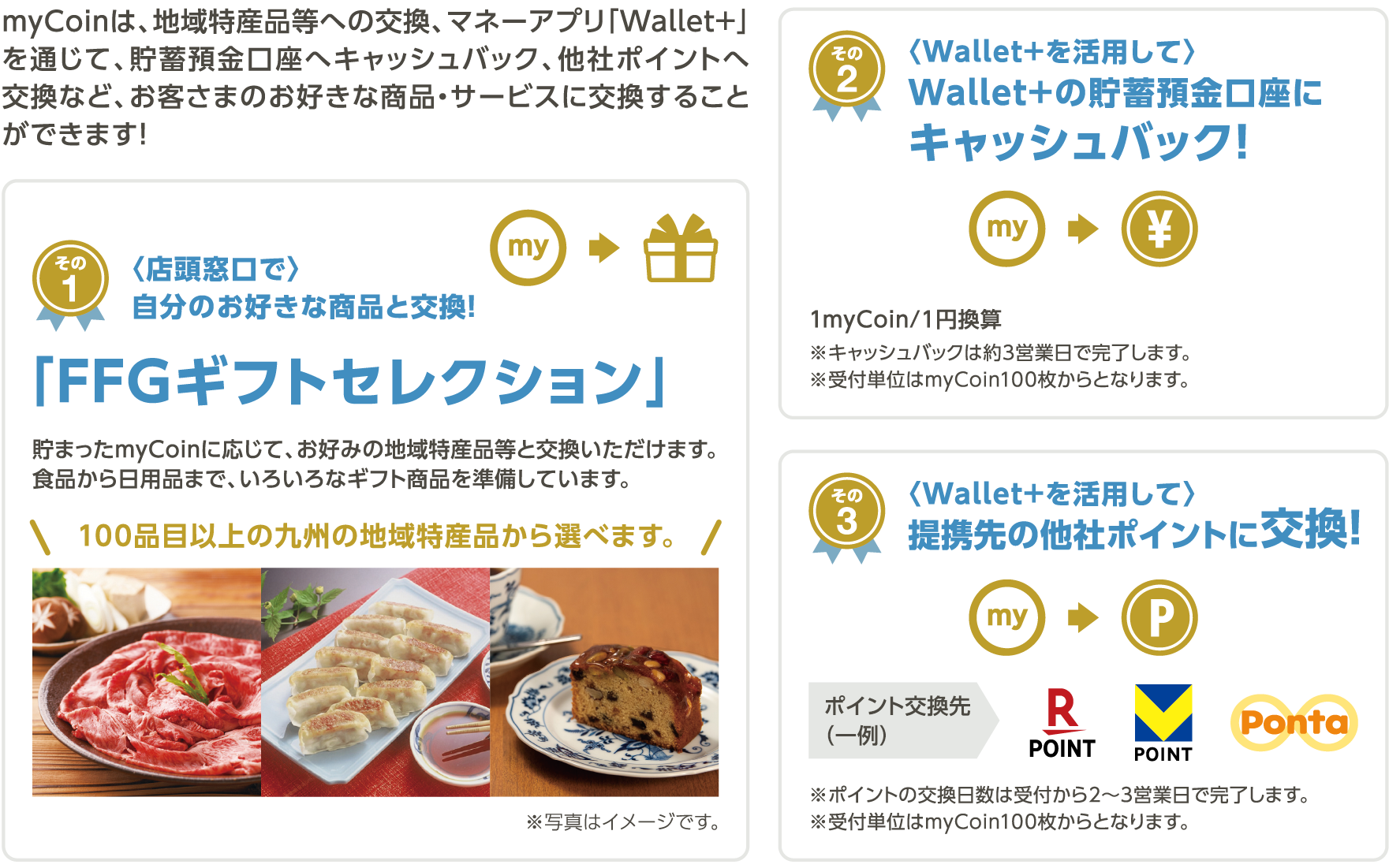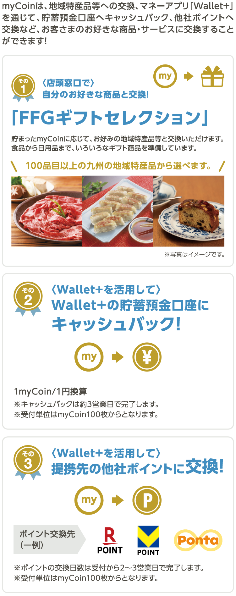 ※ myCoinとは、マネーアプリWallet+を提供するiBankマーケティング株式会社(株式会社ふくおかフィナンシャルグループの連結子会社)が運営するポイントサービスです。マネーアプリのご利用で、預金口座へキャッシュバック(myCoin1枚=1円)が可能です。