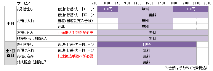 - 上表はご利用時間帯が最も長い自動サービスコーナーの例であり、ご利用時間帯及びサービスの内容は自動サービスコーナーごとに異なります。また、共同サービスコーナーによっては手数料が異なる場合がございます。